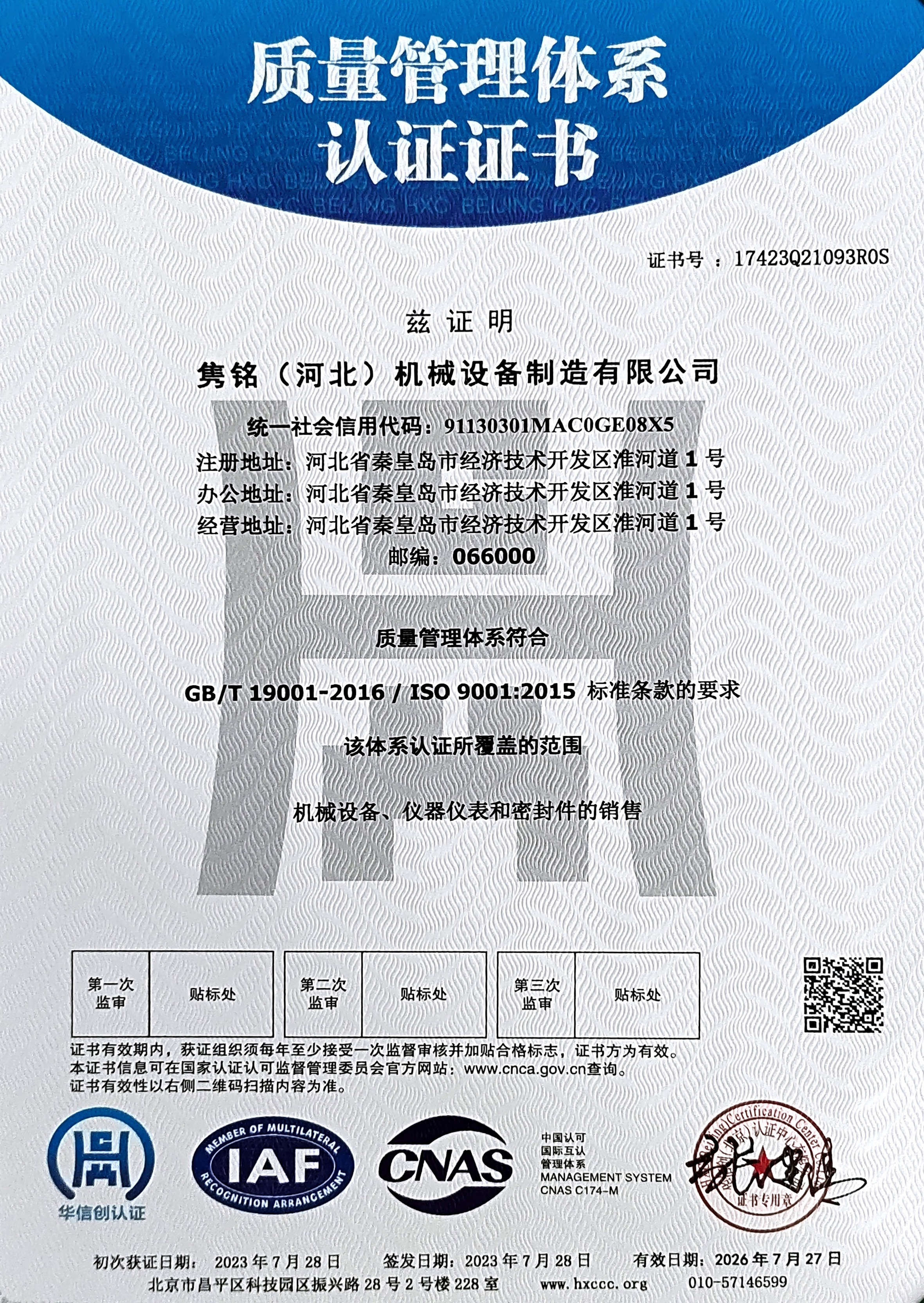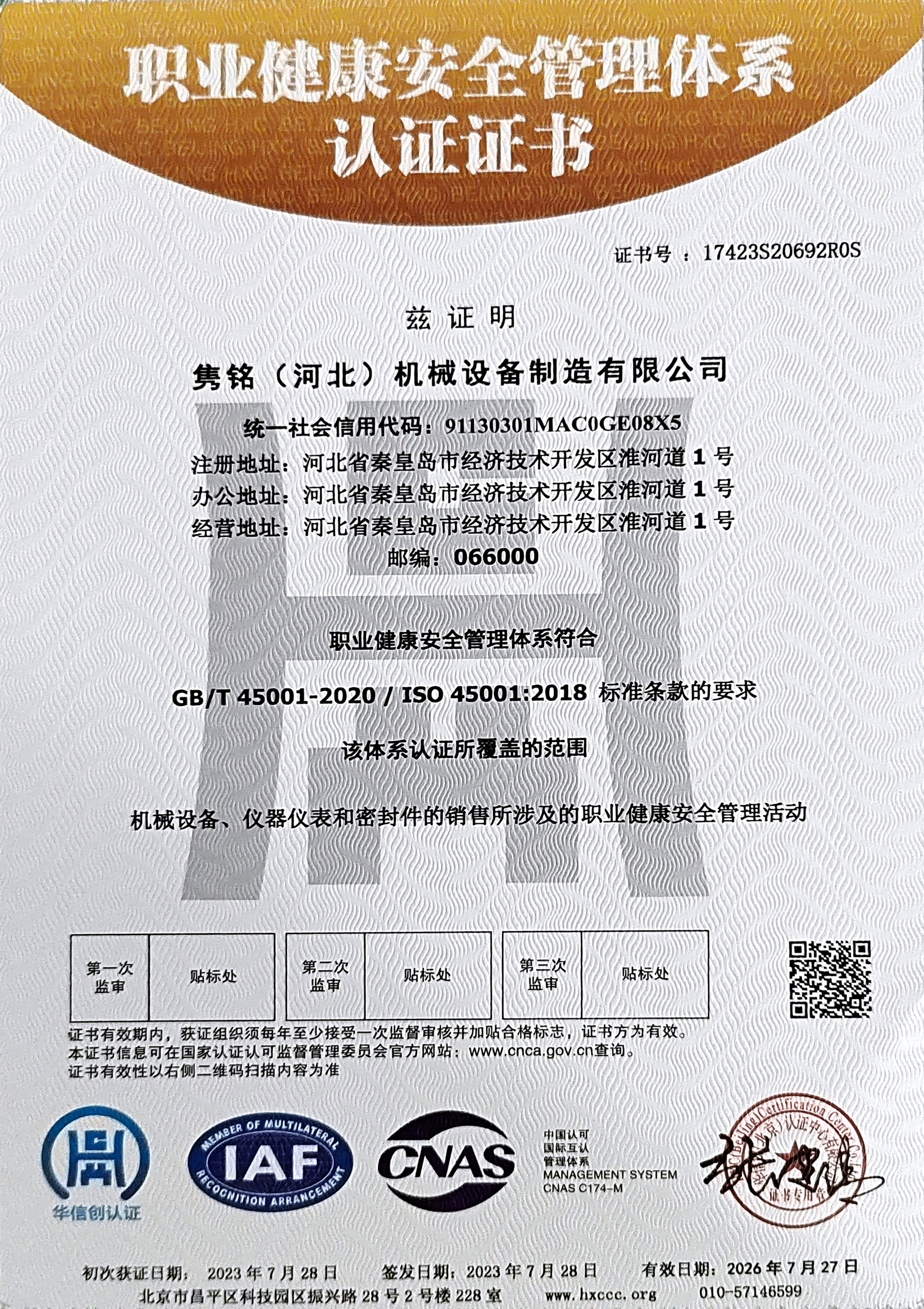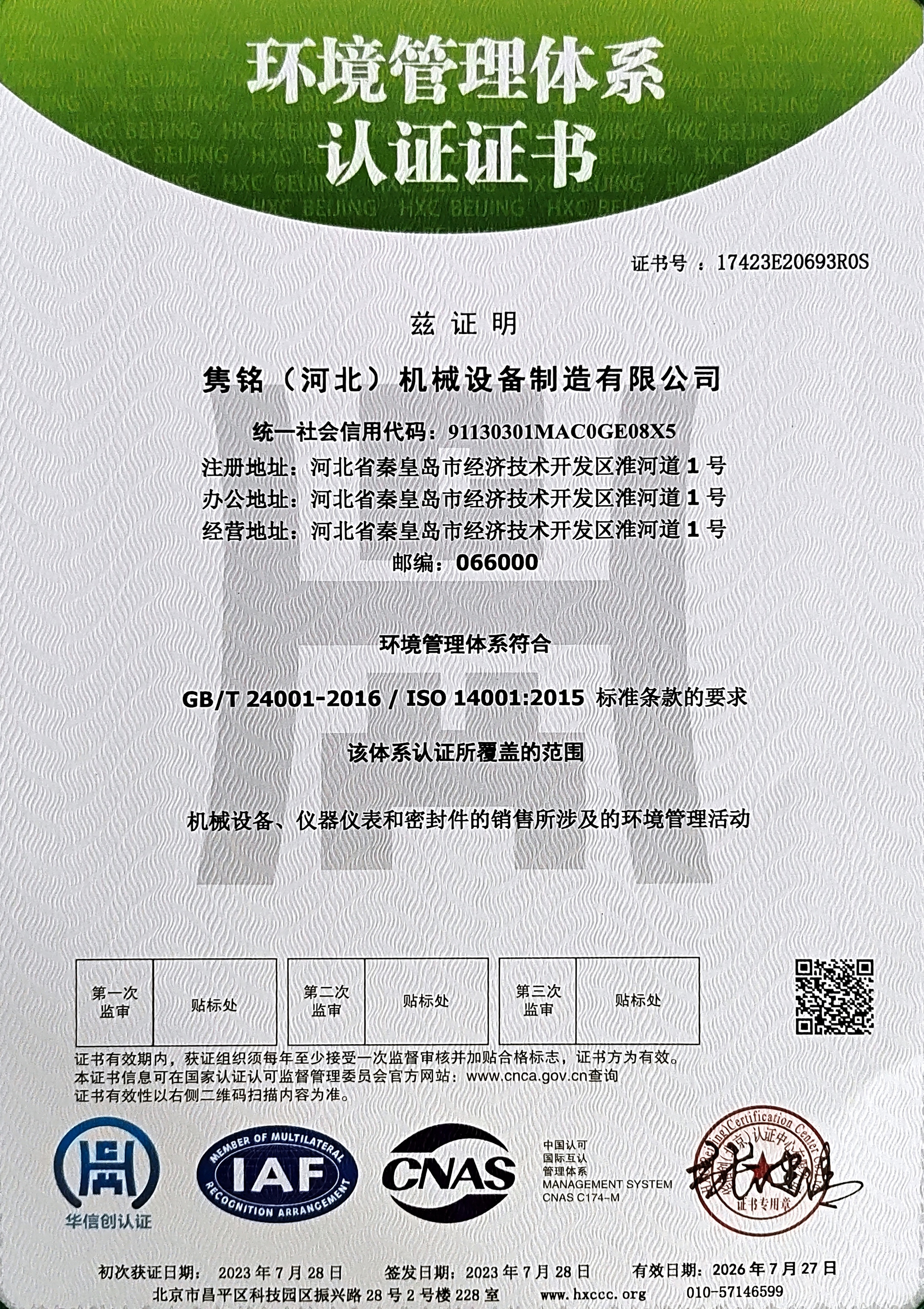 總之,雋銘(河北)機械設備制造有限公司通過ISO9001質(zhì)量管理體系、ISO14001環(huán)境管理體系和ISO45001職業(yè)健康安全管理體系的三體系認證,標志著公司在質(zhì)量管理、環(huán)保和職業(yè)健康安全方面的努力得到了認可。這將為公司的持續(xù)發(fā)展提供強有力的支持,同時也有助于提高整個機械設備制造行業(yè)的水平和標準。