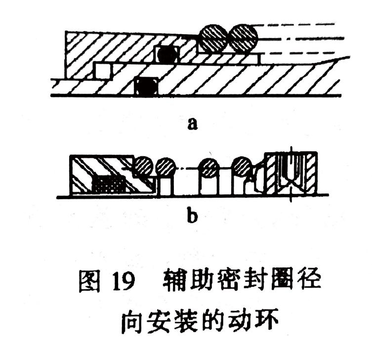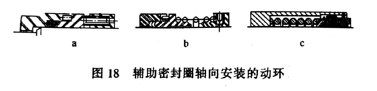 靠輔助密封圈軸向裝置的動(dòng)環(huán)(圖18),靠彈簧力壓緊密封圈來實(shí)現(xiàn)密封。彈簧力可視為不變化,密封可靠、使用壽命長、安裝較為便利,從而得到廣泛應(yīng)用。