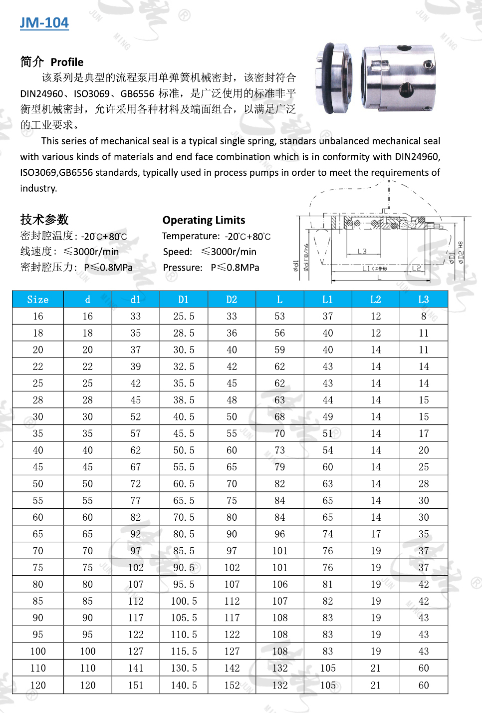 該系列是典型的流程泵用單彈簧機(jī)械密封,該密封符合 DIN24960、ISO3069、GB6556標(biāo)準(zhǔn),是廣泛使用的標(biāo)準(zhǔn)非平衡型機(jī)械密封,允許采用各種材料及端面組合,以滿足廣泛的工業(yè)要求。