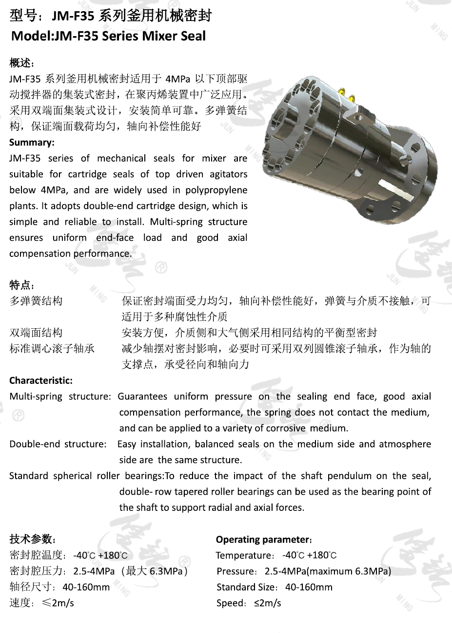 JM-F35系列釜用機(jī)械密封適用于4MPa以下頂部驅(qū)動(dòng)攪拌器的集裝式密封,在聚丙烯裝置中廣泛應(yīng)用。采用雙端面集裝式設(shè)計(jì),安裝簡(jiǎn)單可靠。多彈簧結(jié)構(gòu),保證端面載荷均勻,軸向補(bǔ)償性能好