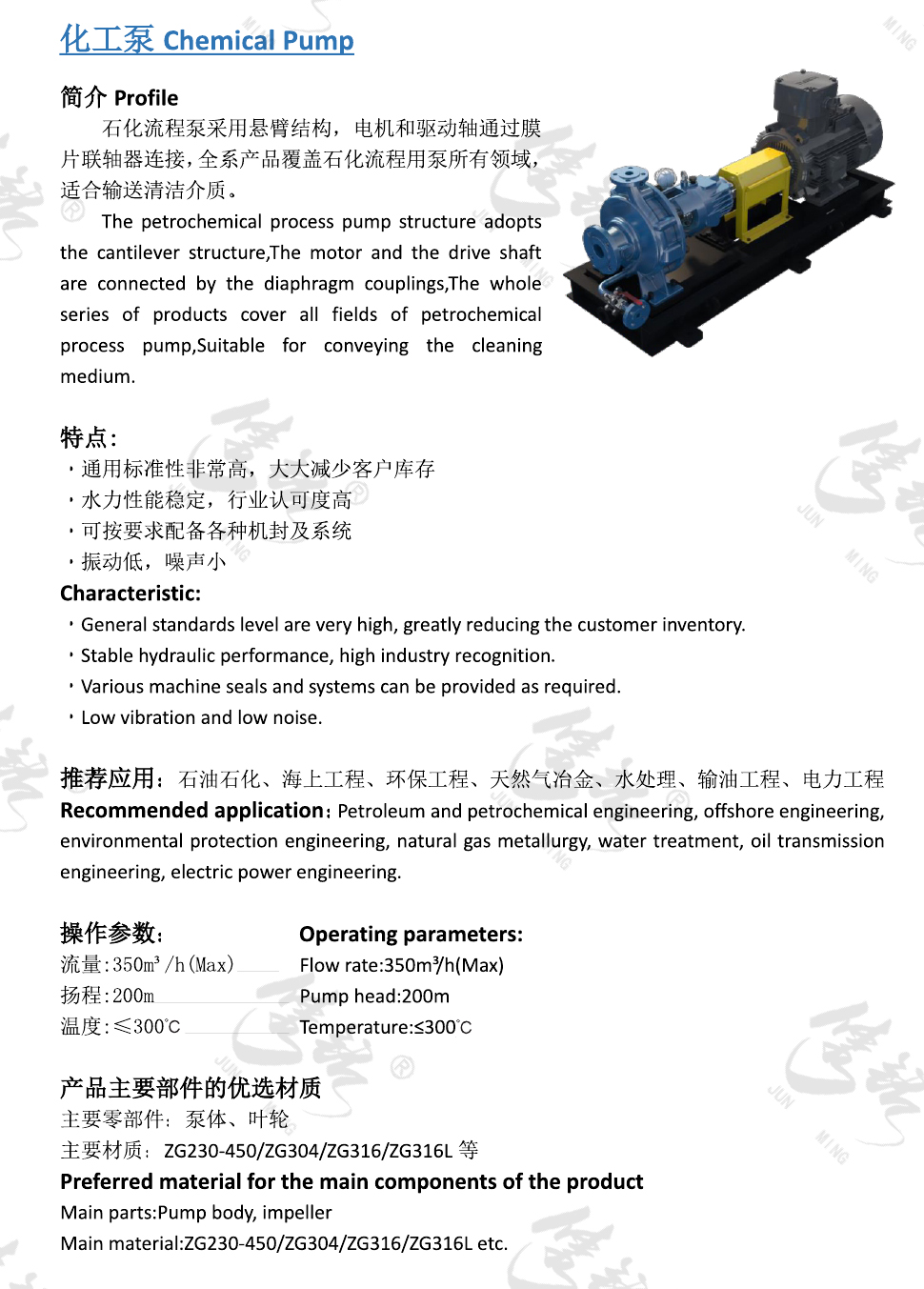 石化流程泵采用懸臂結(jié)構(gòu),電機和驅(qū)動軸通過膜片聯(lián)軸器連接,全系產(chǎn)品覆蓋石化流程用泵所有領(lǐng)域,適合輸送清潔介質(zhì)。